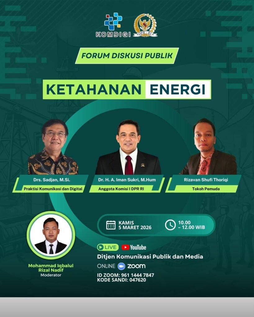 Jakarta – Badan Pengembangan Sumber Daya Manusia (BPSDM) Komunikasi dan Digital bersama Anggota Komisi I DPR RI H. A. Imam Sukri, M.Hum menggelar webinar Forum Diskusi Publik bertema “Ketahanan Energi” pada Kamis (5/3). Webinar tersebut menghadirkan sejumlah narasumber dari berbagai latar belakang, mulai dari anggota DPR RI, praktisi komunikasi digital hingga tokoh pemuda. Diskusi menyoroti […]