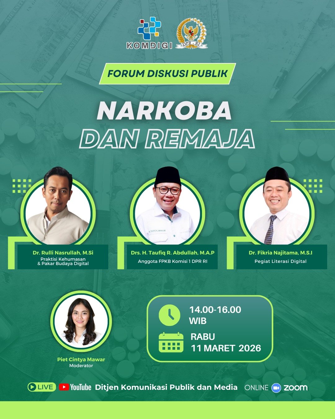 JakartaBadan Pengembangan Sumber Daya Manusia Komunikasi dan Digital menggelar webinar Forum Diskusi Publik bertema Narkoba dan Remaja” pada Rabu (11/3/2026). Kegiatan ini menghadirkan narasumber dari kalangan legislatif, akademisi, dan pegiat literasi digital untuk membahas ancaman penyalahgunaan narkoba di kalangan generasi muda.