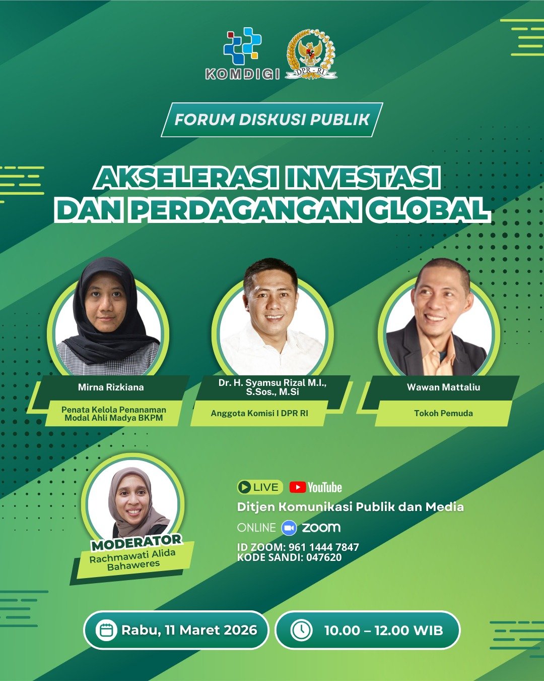 Dalam kesempatan yang sama, tokoh pemuda Wawan Mataliu menilai arah kebijakan investasi Indonesia saat ini difokuskan pada transformasi ekonomi yang lebih merata dan berkelanjutan. Pemerintah menargetkan Indonesia menjadi safe haven ekonomi global yang stabil serta menarik bagi investor.
